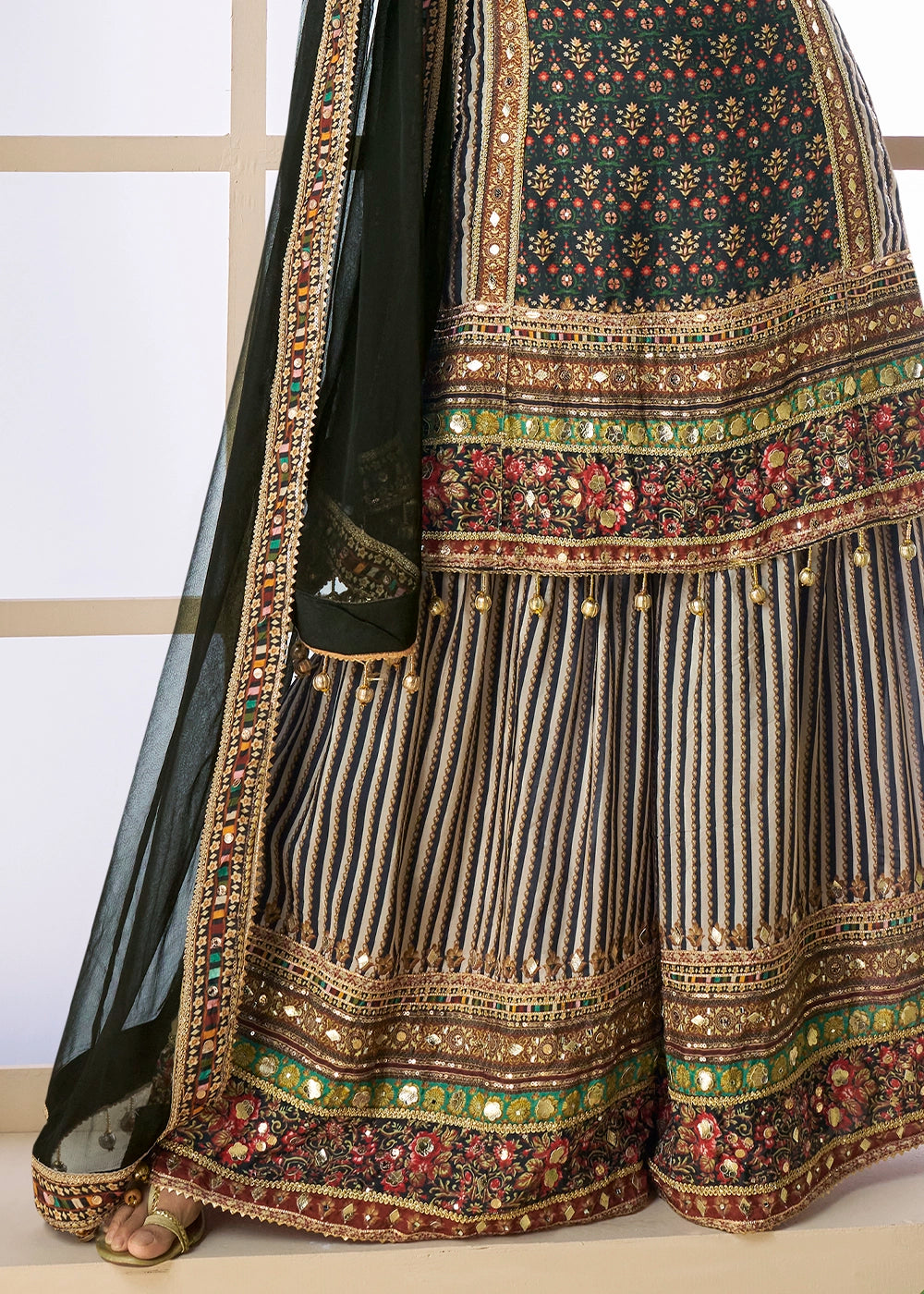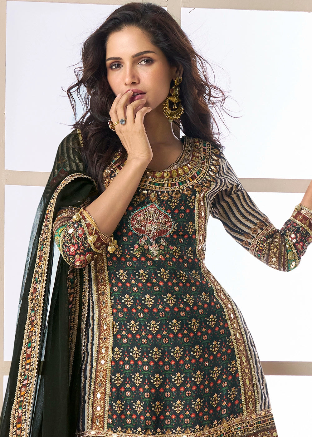 Be the best dressed at every party and festive occasion with this elegant black and multicolor sharara kurta set from a luxe collection. Crafted in premium quality crepe silk the outfit features beautiful multicolor buti prints that highlight its rich traditional appeal.