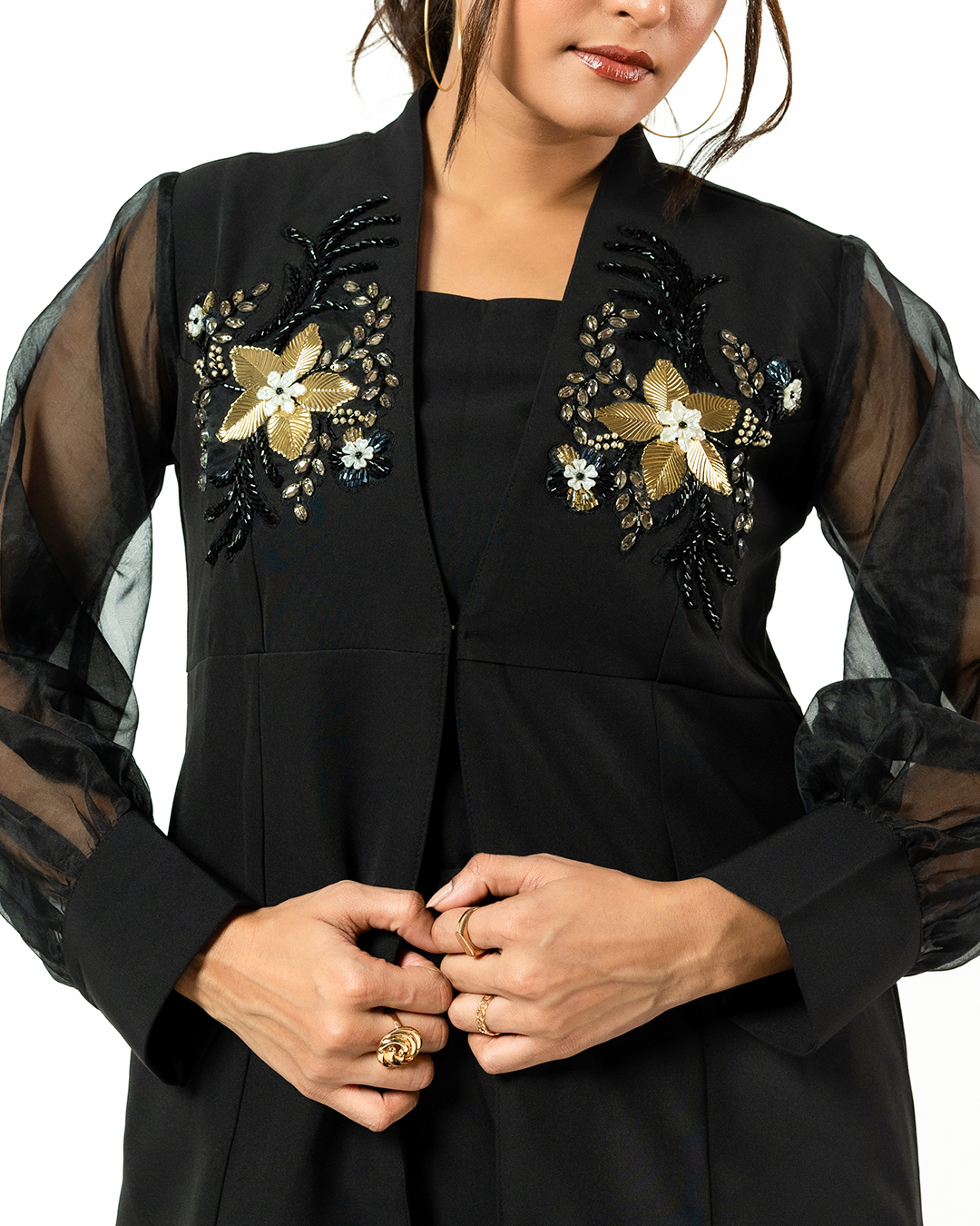 The outfit features a clean inner top layered with a structured jacket highlighted by sculpted metal floral embellishments. The flowers have a distinctive molten metal finish giving a bold artistic texture to the design. These metal floral elements are enhanced with delicate bead and crystal detailing creating a rich luxurious appeal
