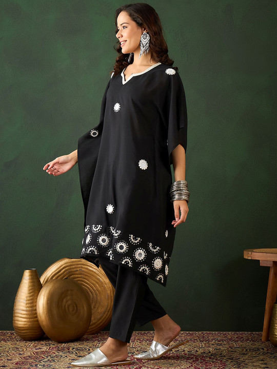 Step into effortless elegance with this stunning Black Kaftan Kurta with Trouser Set, designed to give you a perfect balance of comfort and festive charm. The flowy kaftan silhouette drapes beautifully on the body, making it flattering and easy to wear for long hours