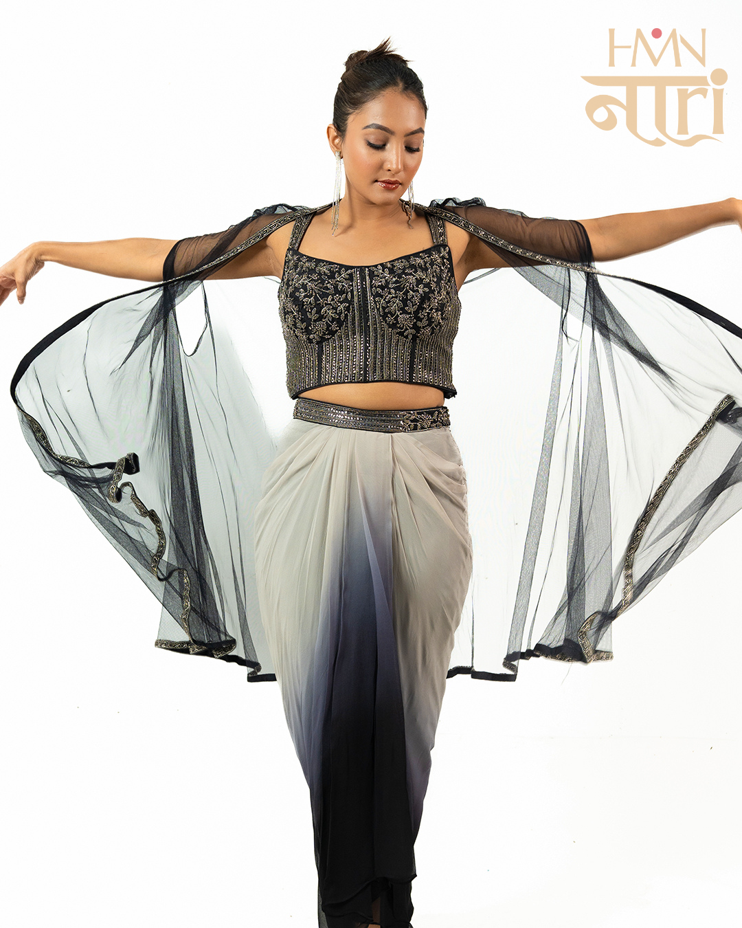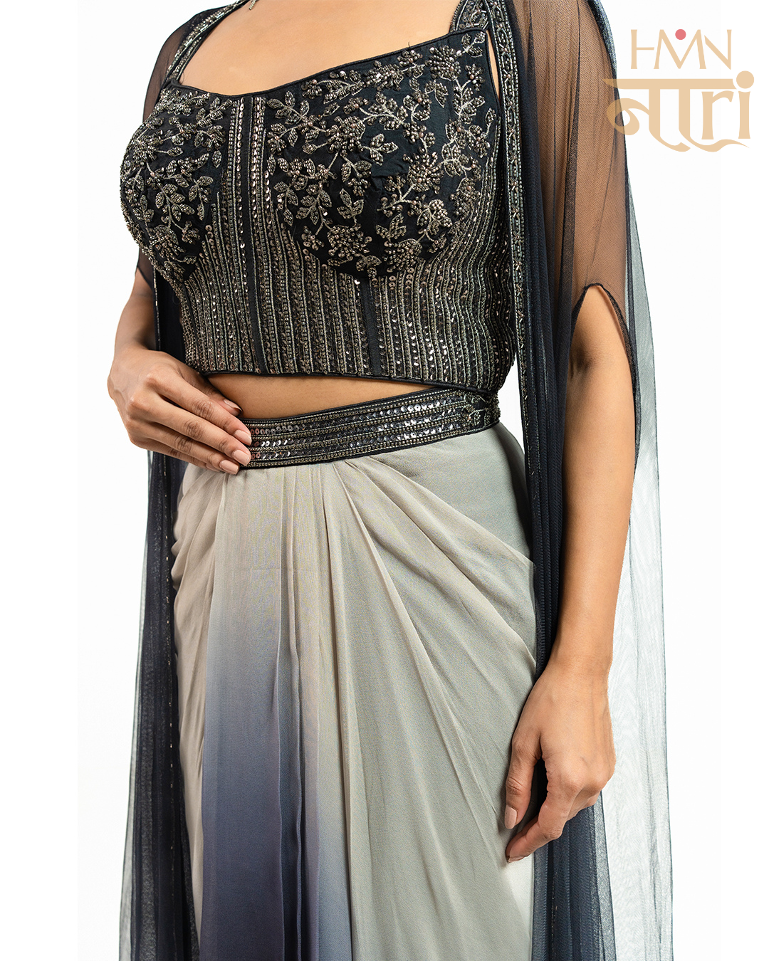 Hand Embroidered Black and Grey Ombre Drape Skirt Set with Cape