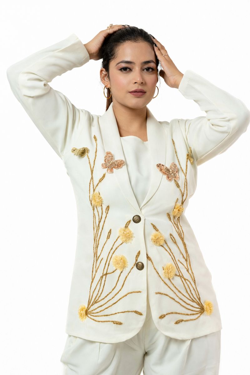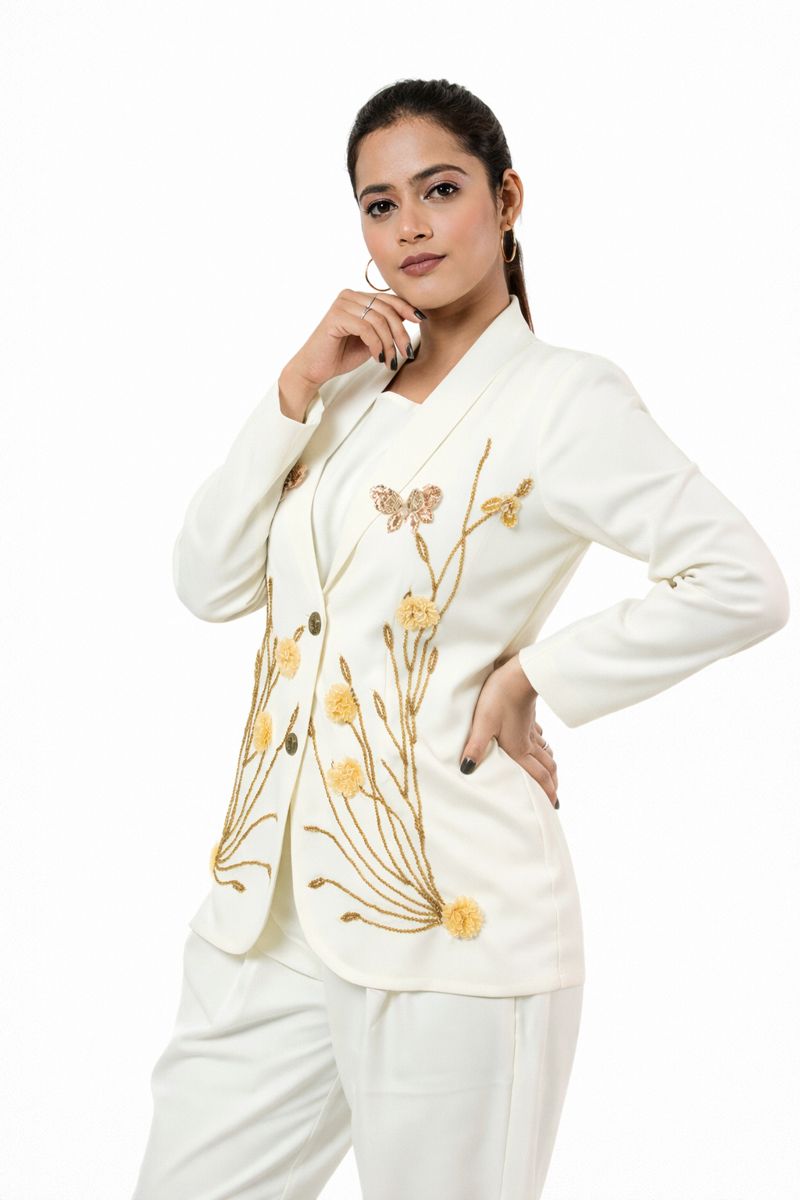 The blazer style jacket features elegant hand embroidery with delicate floral motifs enhanced using beads sequins and fabric applique work. The embroidery flows gracefully across the front creating a refined statement while maintaining a clean tailored silhouette
