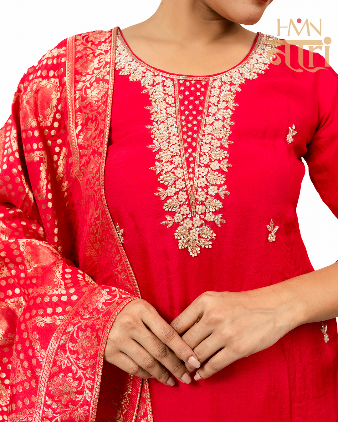 Step into elegance with our Pink Hand-Embroidered Kurta Set with Banarasi Dupatta from House of Modern Naari. The kurta is crafted in a soft pink tone and adorned with intricate hand embroidery on the neckline and sleeves, adding a touch of artisanal charm. Paired with a comfortable bottom and a statement Banarasi silk dupatta featuring golden woven motifs, this set perfectly balances traditional craftsmanship with modern style. Whether it’s for weddings, festive gatherings, or special occasions, this outfit ensures you shine with grace.