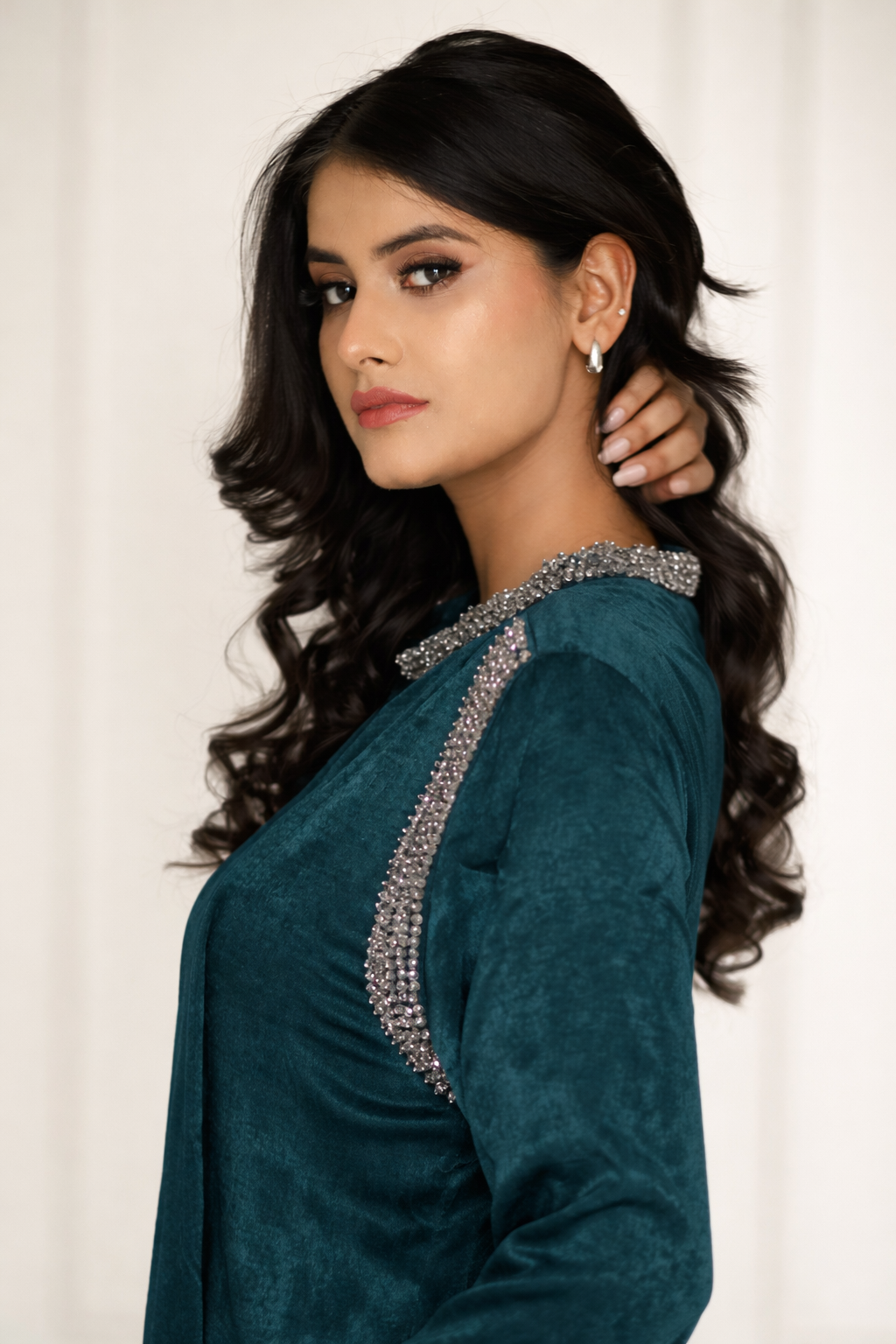 Elevate your ethnic wardrobe with this stunning Premium Teal Green Hand Work Kurta, designed for women who love graceful silhouettes with a luxurious finish. Crafted in a rich textured fabric, this kurta features elegant hand embellished detailing on the neckline and shoulder panels, giving it a refined festive look. The flowy layered drape and stylish cascading ruffle front adds movement and sophistication, making it a perfect statement piece for special occasions.