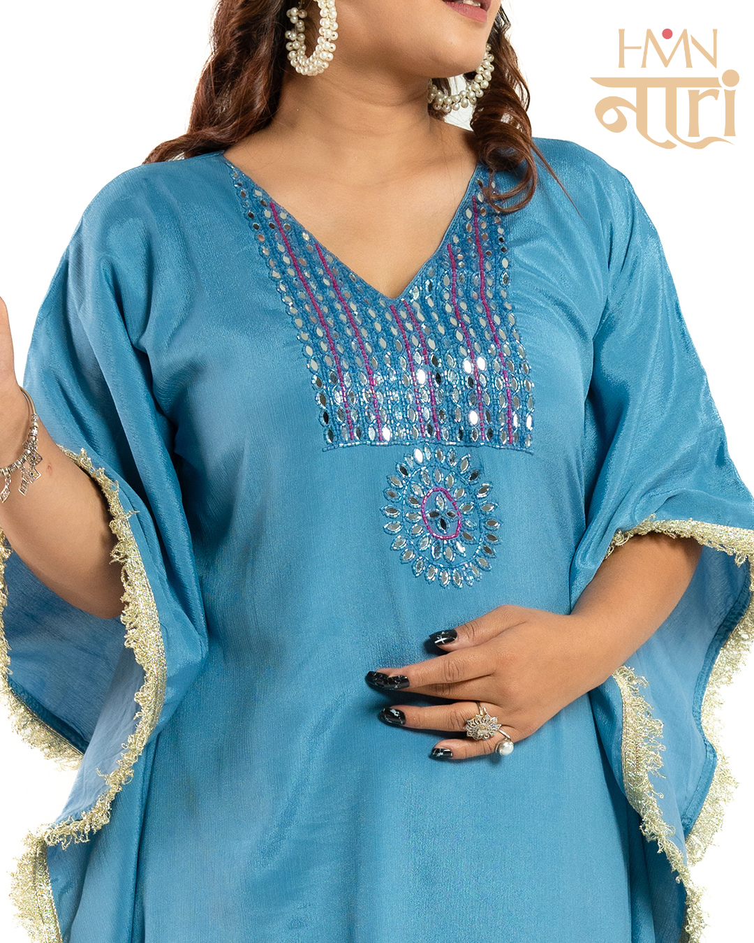 Kurta Style: Kaftan with V-neck and central mirror work embroidery