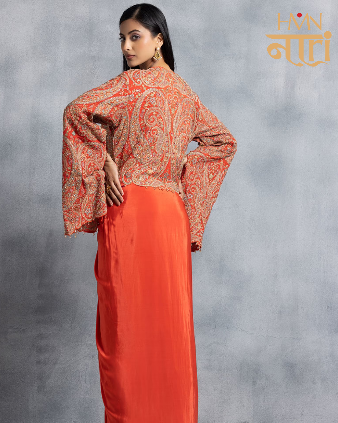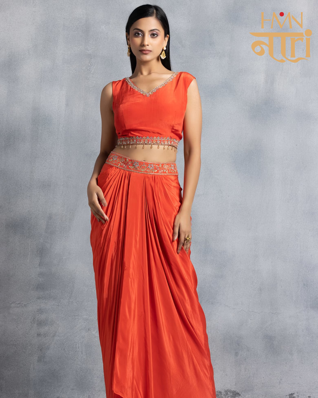 Make a bold and elegant statement with this stunning coral orange Indo-Western draped skirt set, designed for modern festive occasions. The ensemble features a sleek, pre-draped skirt crafted in a smooth, flowy fabric that offers effortless movement and a flattering silhouette.