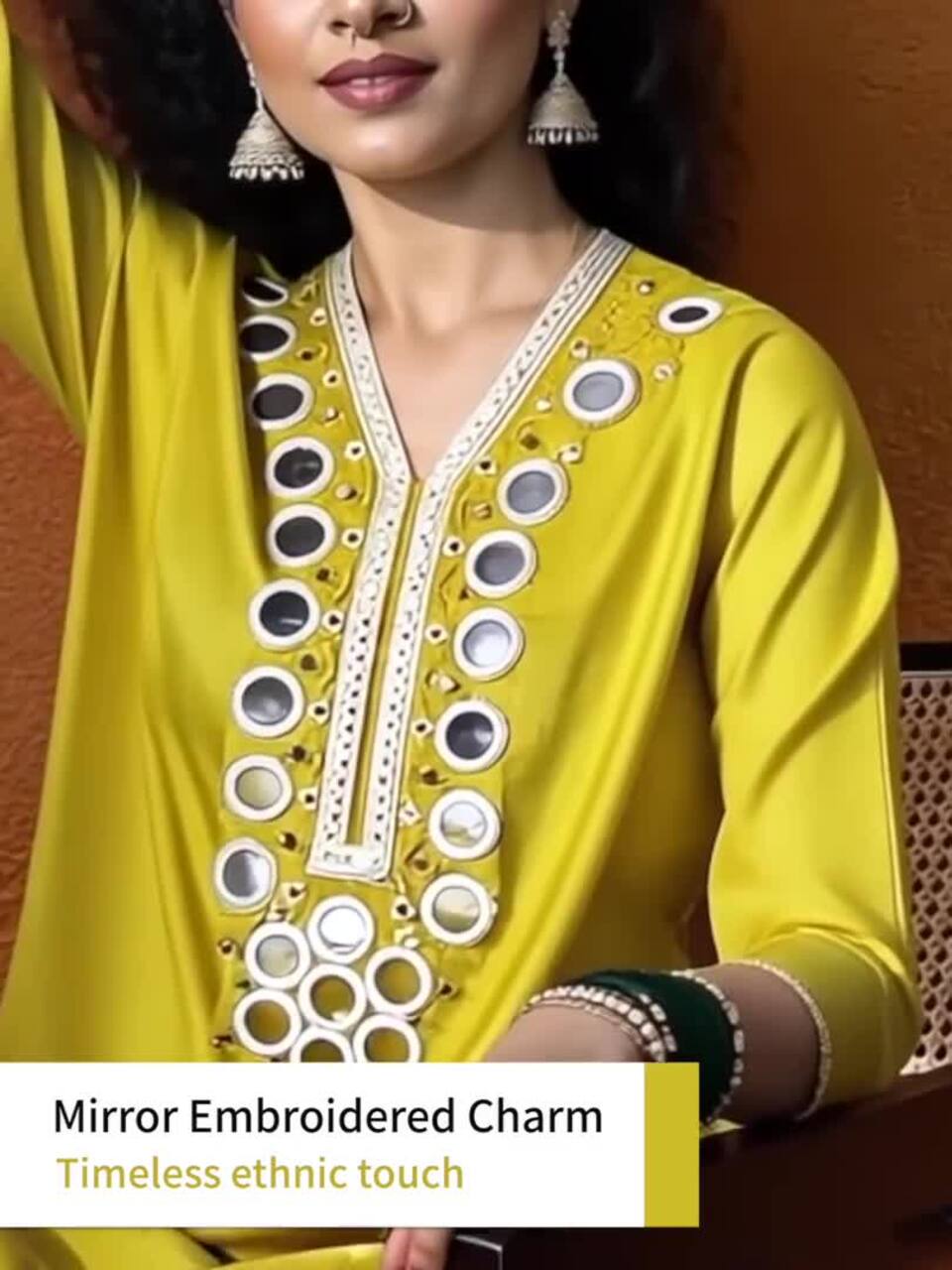 Color: Lime Yellow Style: Tunic with Trouser Co Ord Set Work: Embroidered mirror work neckline detailing Neckline: V neck with mirror embellishment Sleeves: Three fourth sleeves Fit: Comfortable straight fit Hemline: Curved hem finish Bottom: Matching straight trouser Set Includes: 1 Tunic and 1 Trouser Occasion: Festive wear, pooja wear, family functions, celebration wear, day events Care Instructions: Dry clean recommended to maintain embroidery and mirror work