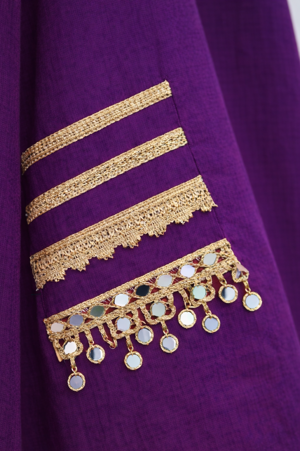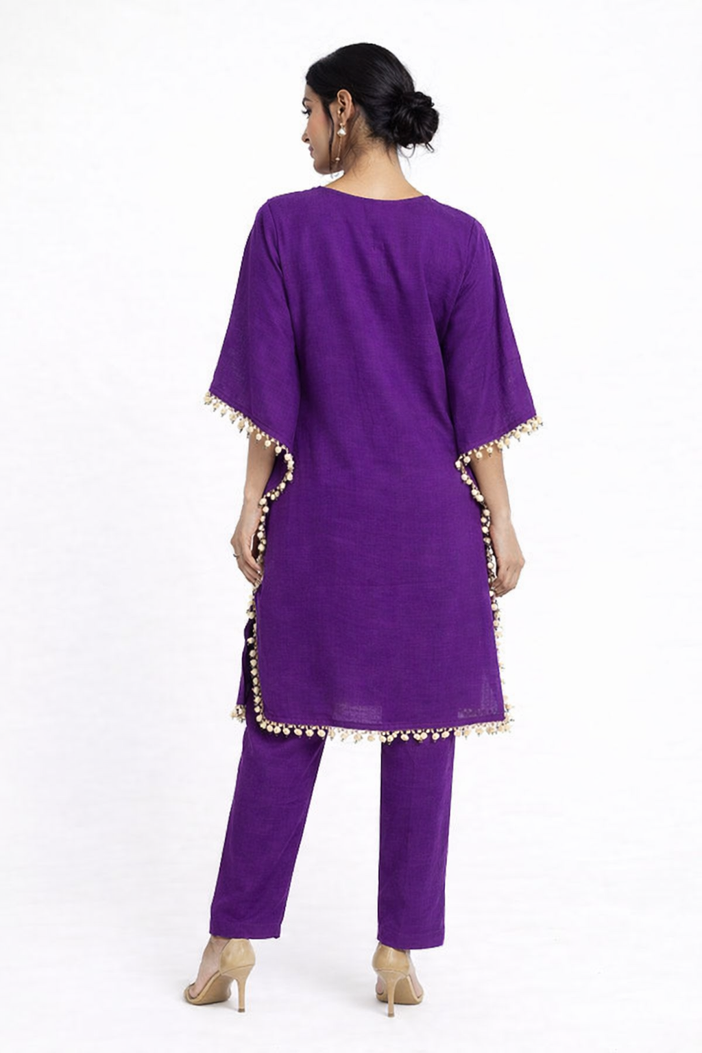 Color: Purple Style: Kaftan Kurta with Straight Pants Fabric: Soft and breathable premium fabric Neckline: Embellished V neck with detailed work Sleeves: Kaftan sleeves with tassel border detailing Fit: Relaxed and comfortable fit Set Includes: 1 Kaftan Kurta and 1 Pant Occasion: Festive wear, party wear, family functions, celebrations, ethnic outings Care: Dry clean recommended for best maintenance