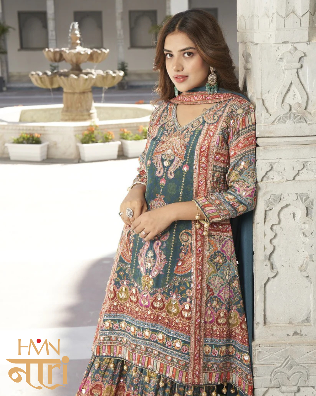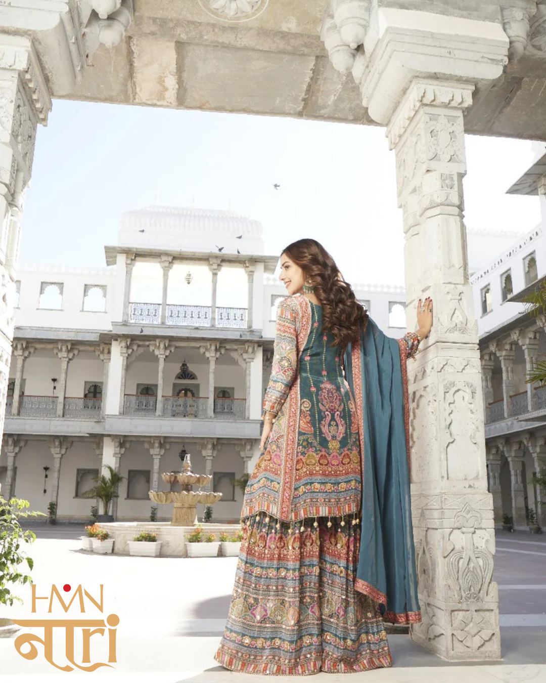 Enhance your festive style with this elegant teal green kurta sharara set crafted in faux georgette fabric that offers a soft flowy drape and graceful movement. The kurta features rich digital prints highlighted with real hand applied mirror work and fancy lace detailing creating a striking traditional appeal.